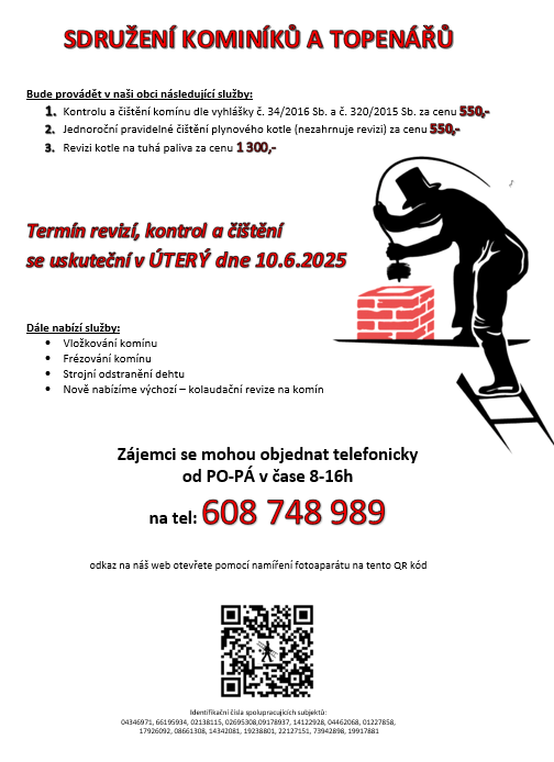 Dne 10. června 2025 se uskuteční revize a čištění kotlů, přičemž cena za jednorázové čištění plynového kotle je 550 Kč a revize kotle na tuhá paliva stojí 1300 Kč. Zájemci se mohou objednat telefonicky od pondělí do pátku mezi 8. a 16. hodinou na čísle 608 748 989.