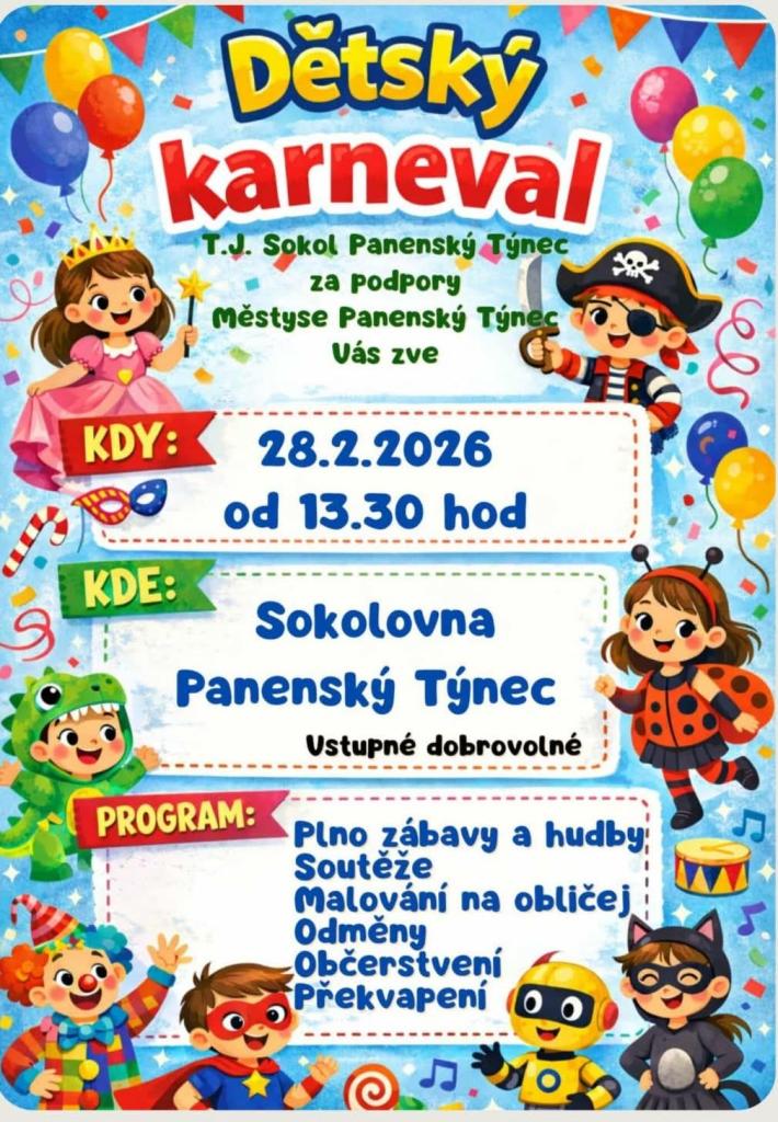 T.J. Sokol Panenský Týnec vás srdečně zve na Dětský karneval, který se koná 28. února 2026 od 13:30 hodin v Sokolovně Panenský Týnec. Připravili jsme pro vás pestrý program plný zábavy, hudby a soutěží. Děti se mohou těšit na malování na obličej, odměny a občerstvení. Přijďte se pobavit a zažít překvapení, které jsme pro vás nachystali.