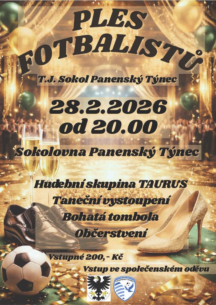 Zveme vás na Ples fotbalistů, který se koná 28. února 2026 od 20:00 v sokolovně v Panenském Týnci. Těšit se můžete na hudební skupinu TAURUS, která se postará o zábavu, a na taneční vystoupení, které rozproudí atmosféru večera. Nezapomeňte také na bohatou tombolu, ve které můžete vyhrát zajímavé ceny, a občerstvení, které bude k dispozici po celou dobu akce. Přijďte se pobavit a strávit příjemný večer v dobré společnosti.